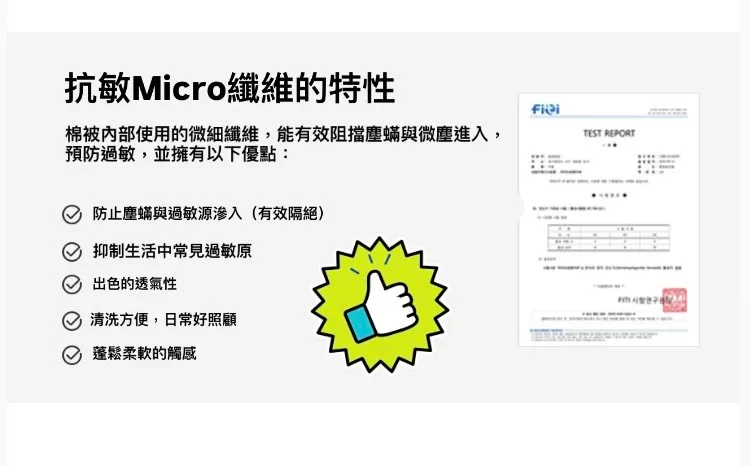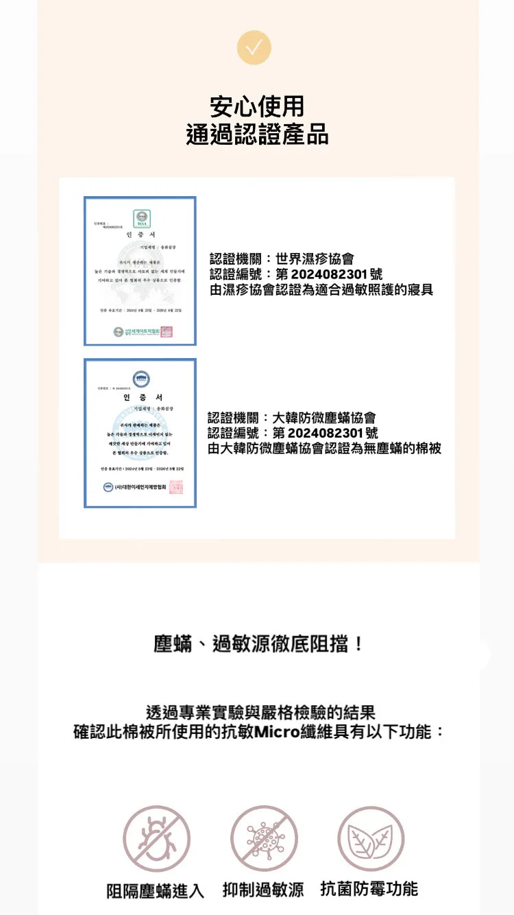 通過世界濕疹協會 & 大韓防微塵蟎協會雙認證,敏感族也能安心蓋整晚